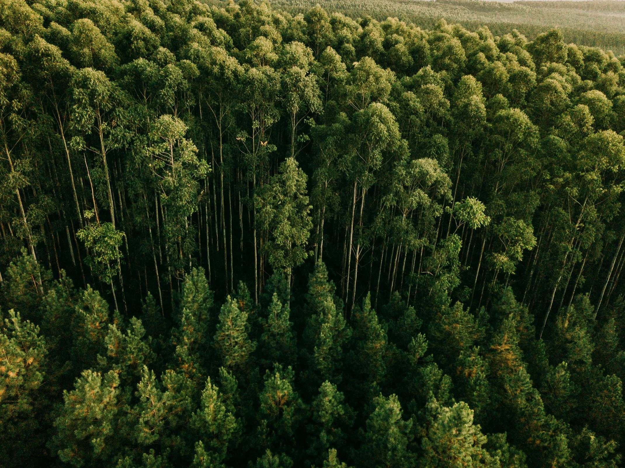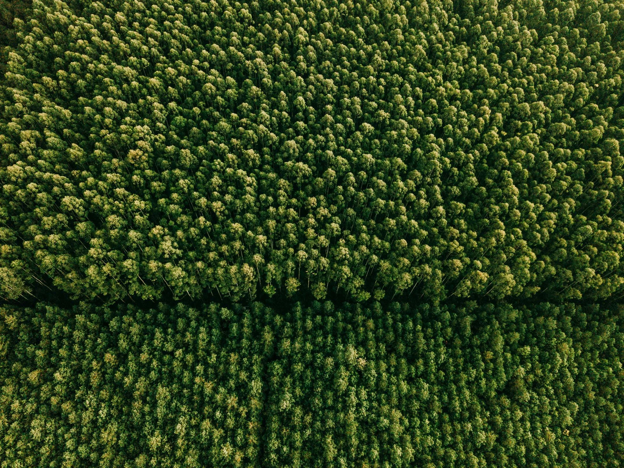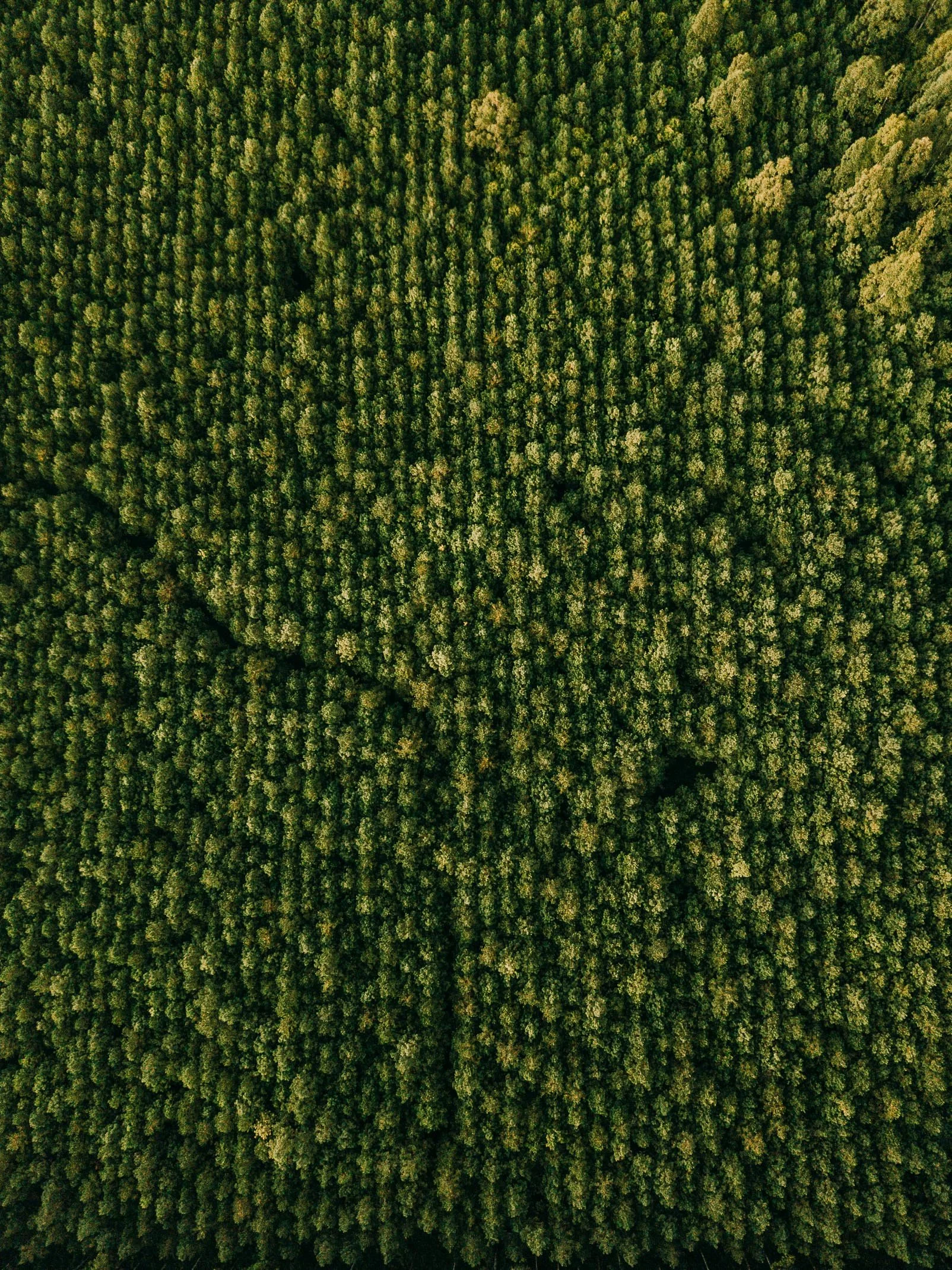 Vista aérea de un bosque frondoso con árboles verdes y densos.