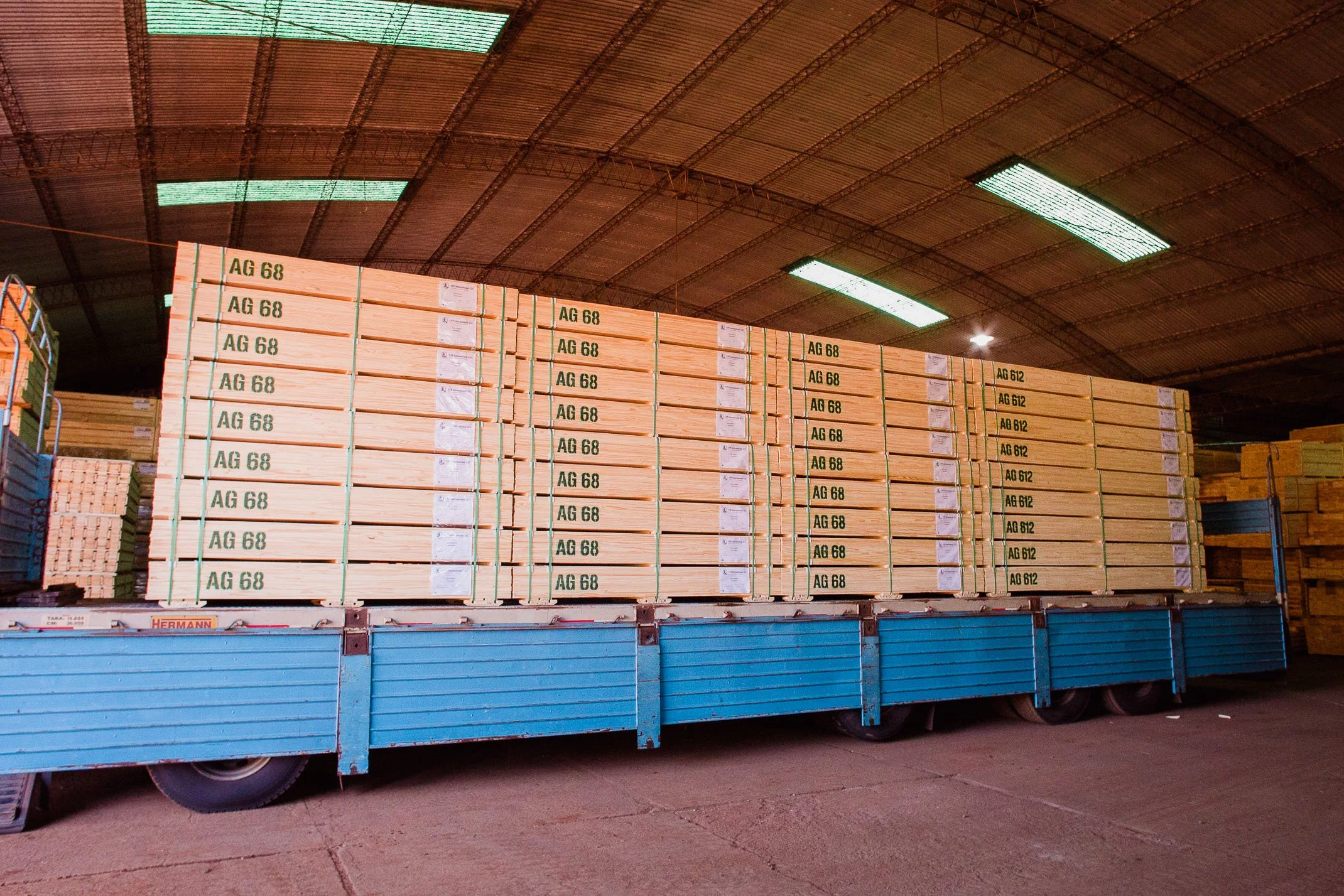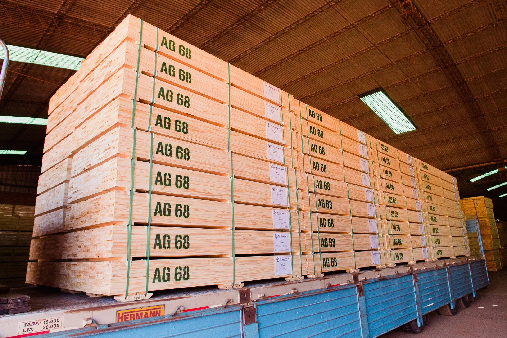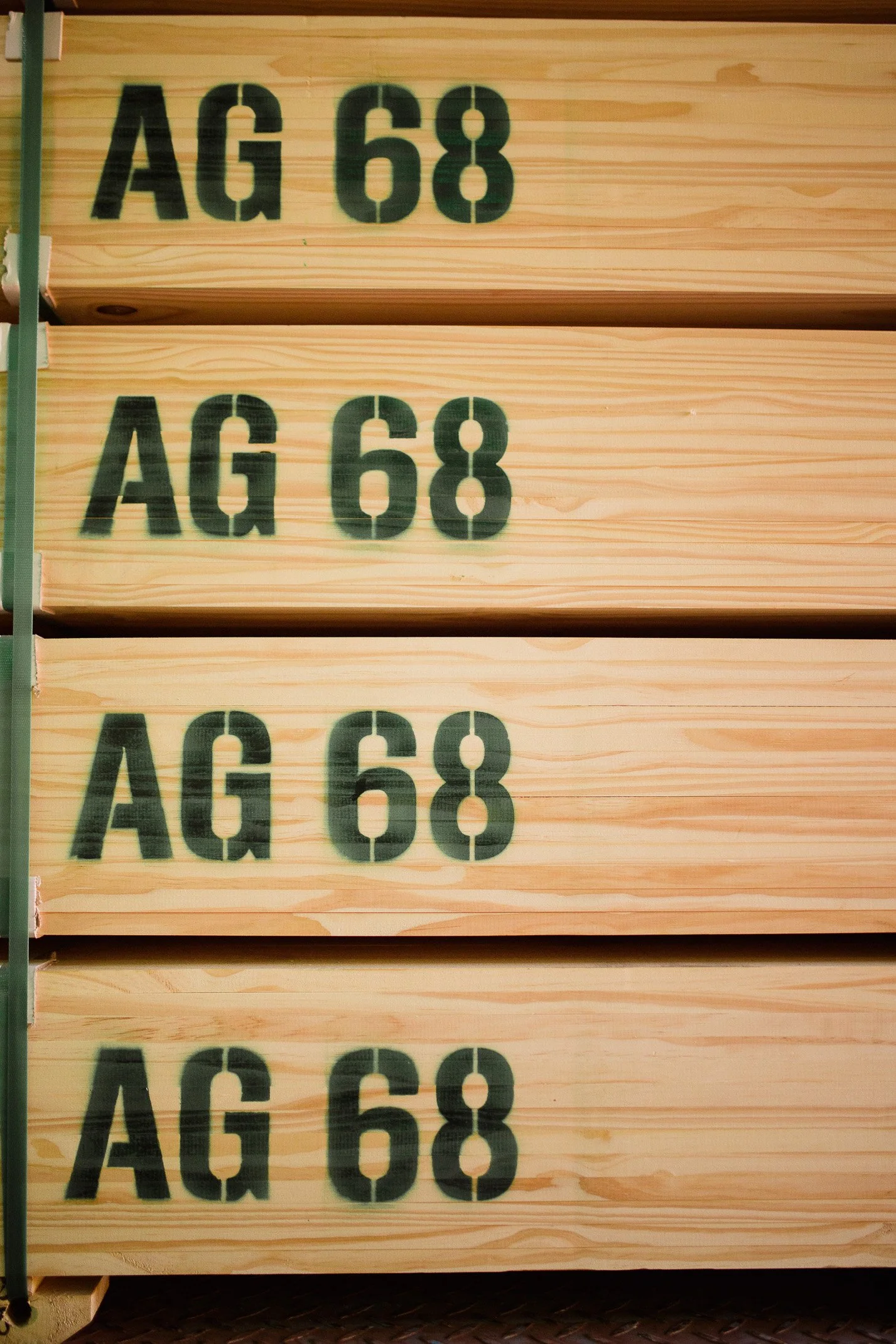 Lote de tablas de madera apiladas, etiquetadas con 'AG 68' en un almacén.