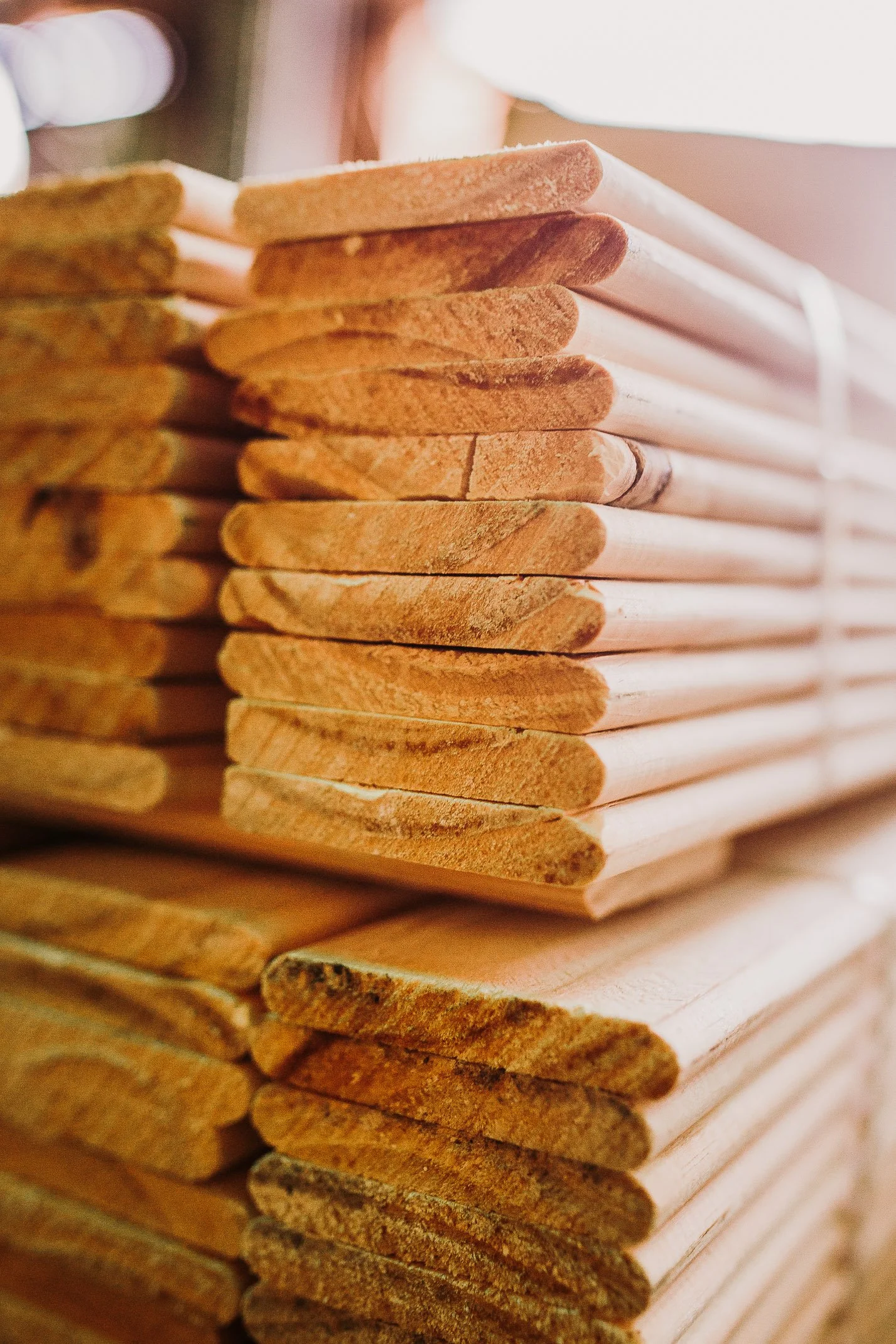 Madera apilada en bloques rectangulares apilados en horizontal.