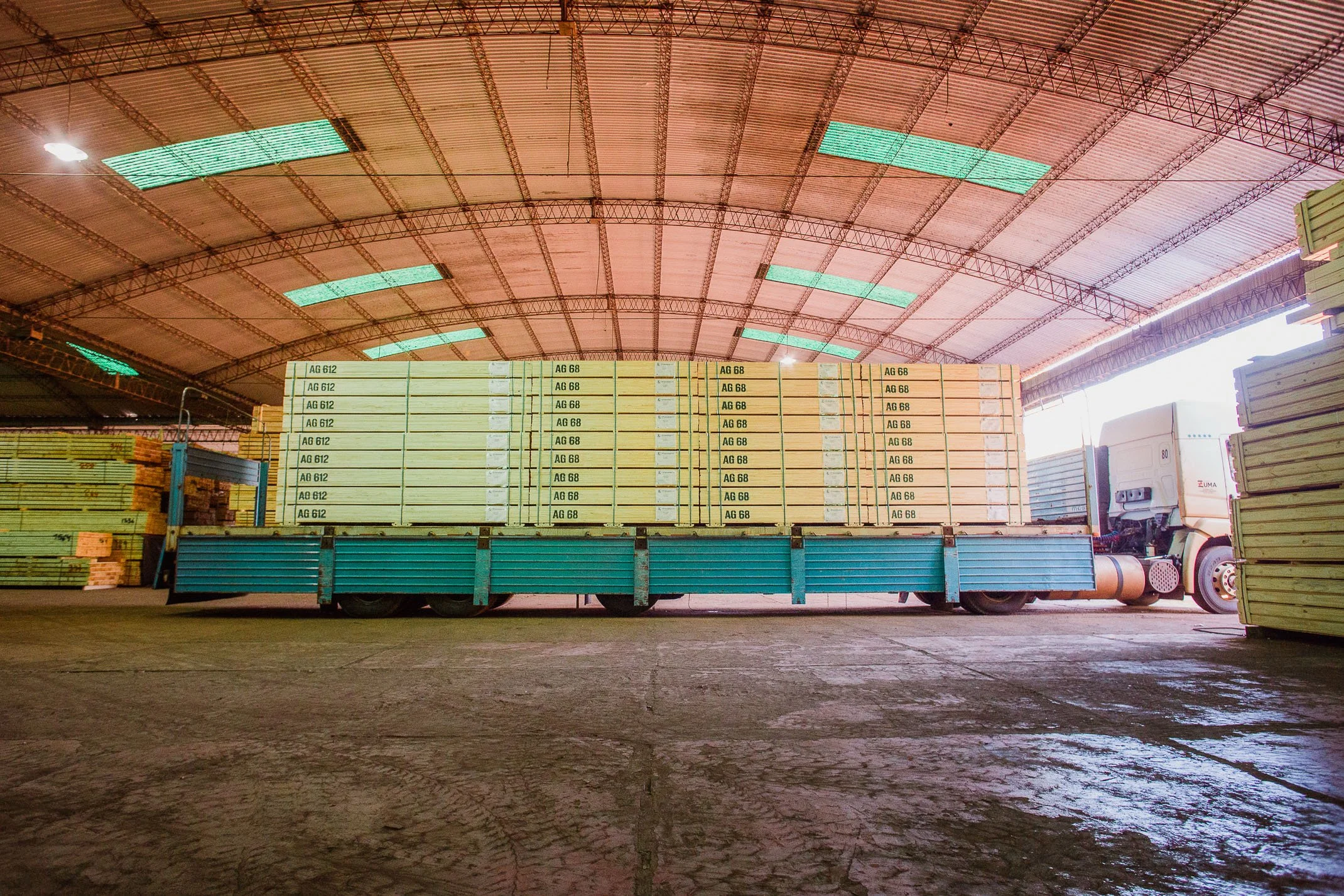 Interior de un almacén con techo de metal, mostrando un camión de carga con varios palets de paneles de madera en un recinto industrial