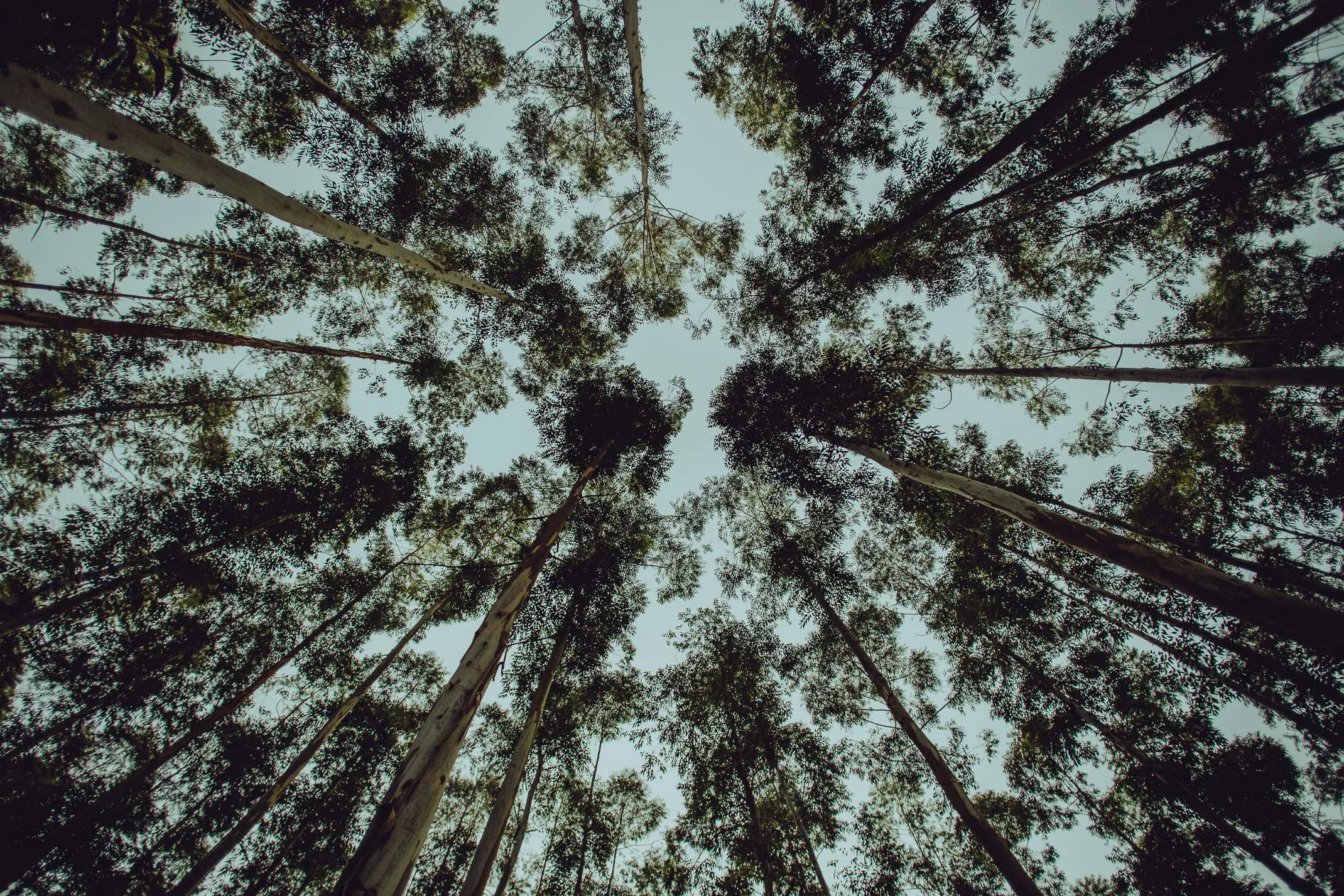Vista hacia arriba de árboles altos en un bosque, con ramas y hojas formando un dosel y el cielo visible en el centro.