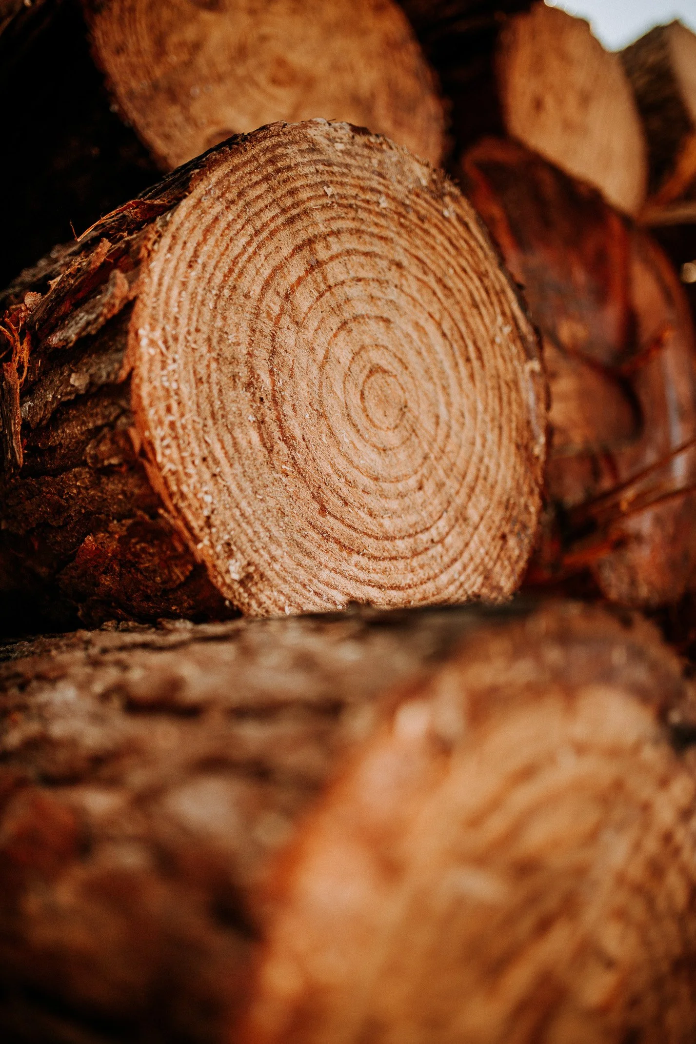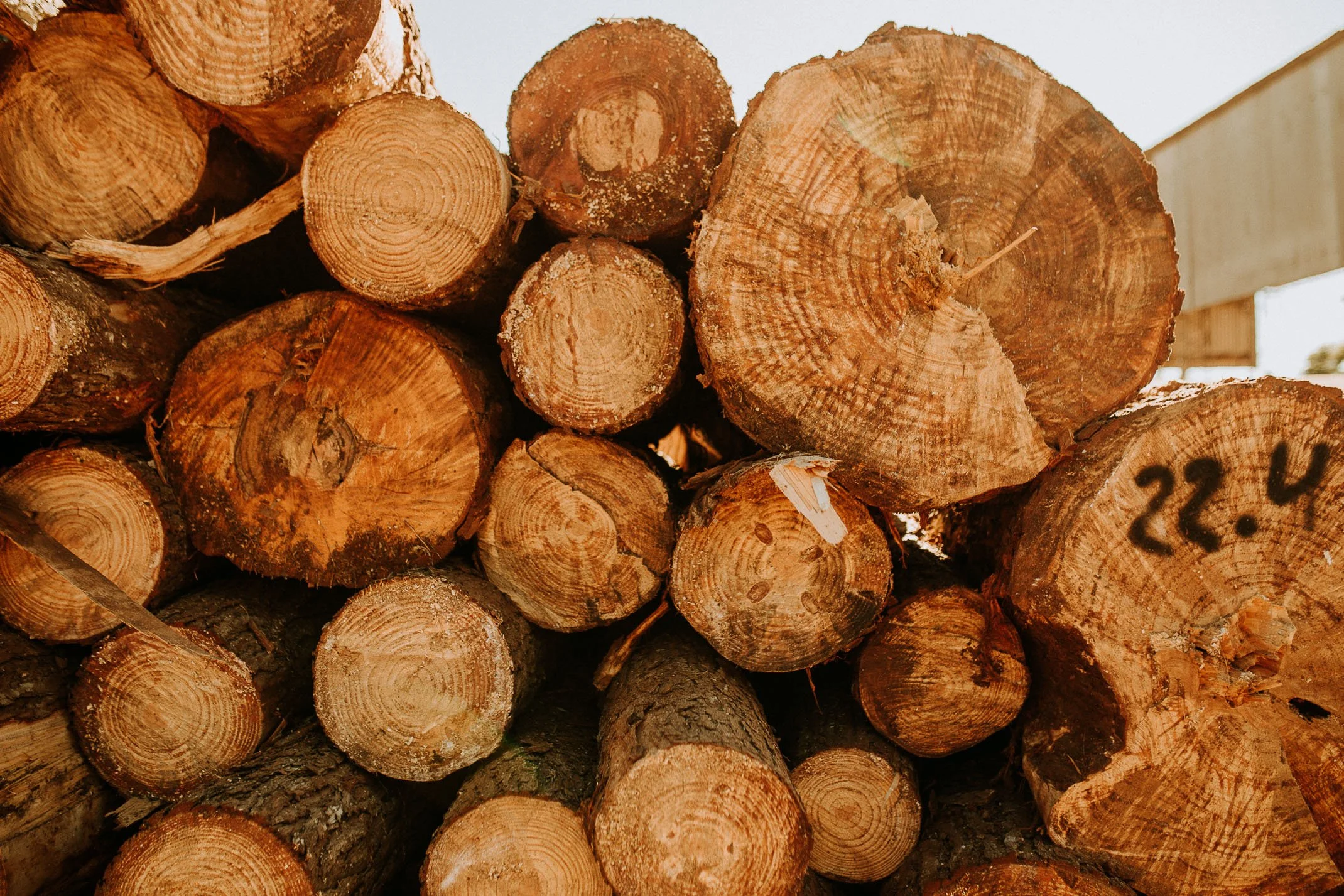 Troncos de madera apilados, algunos con marcas y números escritos.