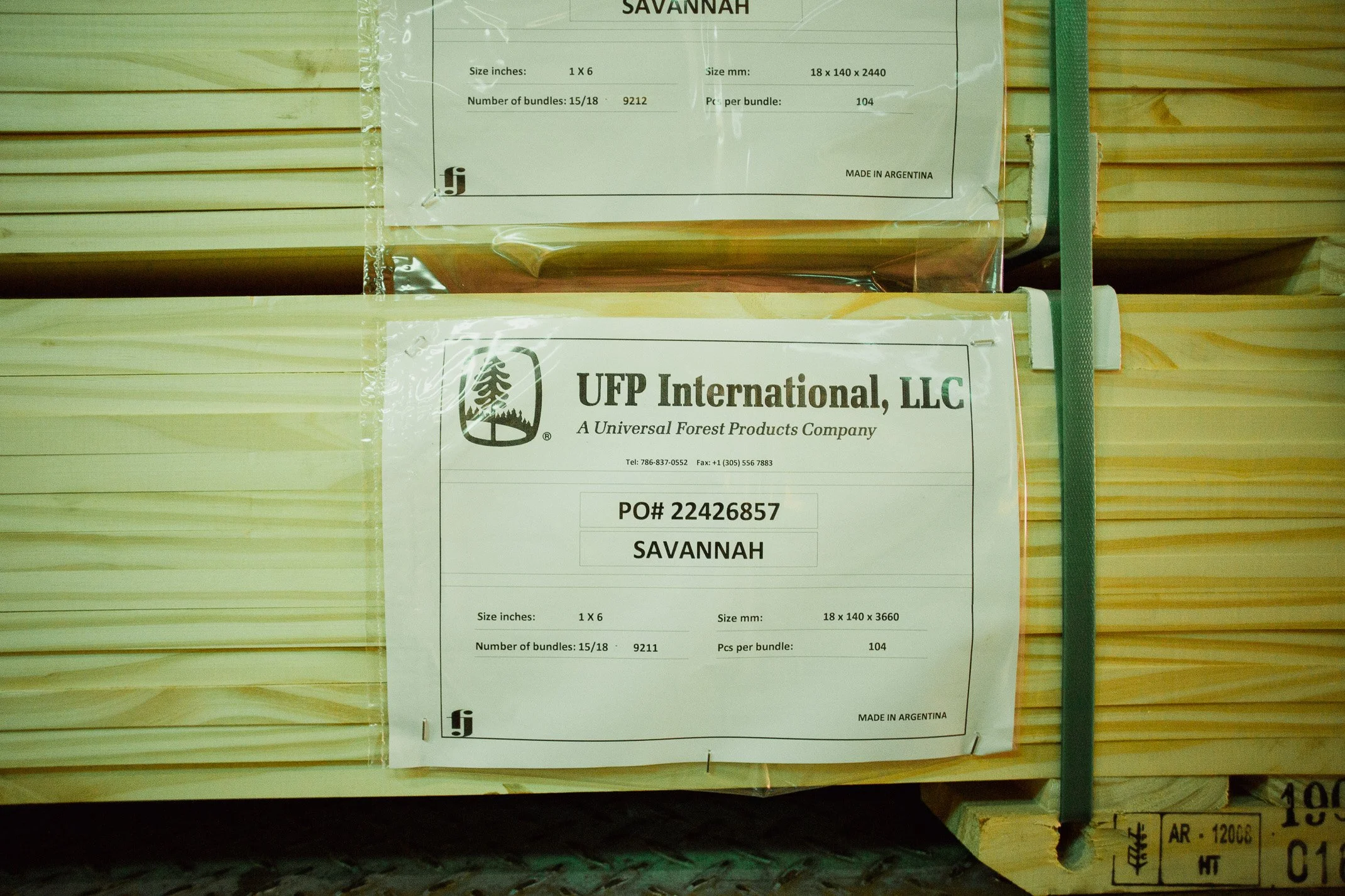 Paquete de productos de madera con etiquetas que indican tamaño, cantidad, y que son hechos en Argentina, de la marca UFP International, LLC.